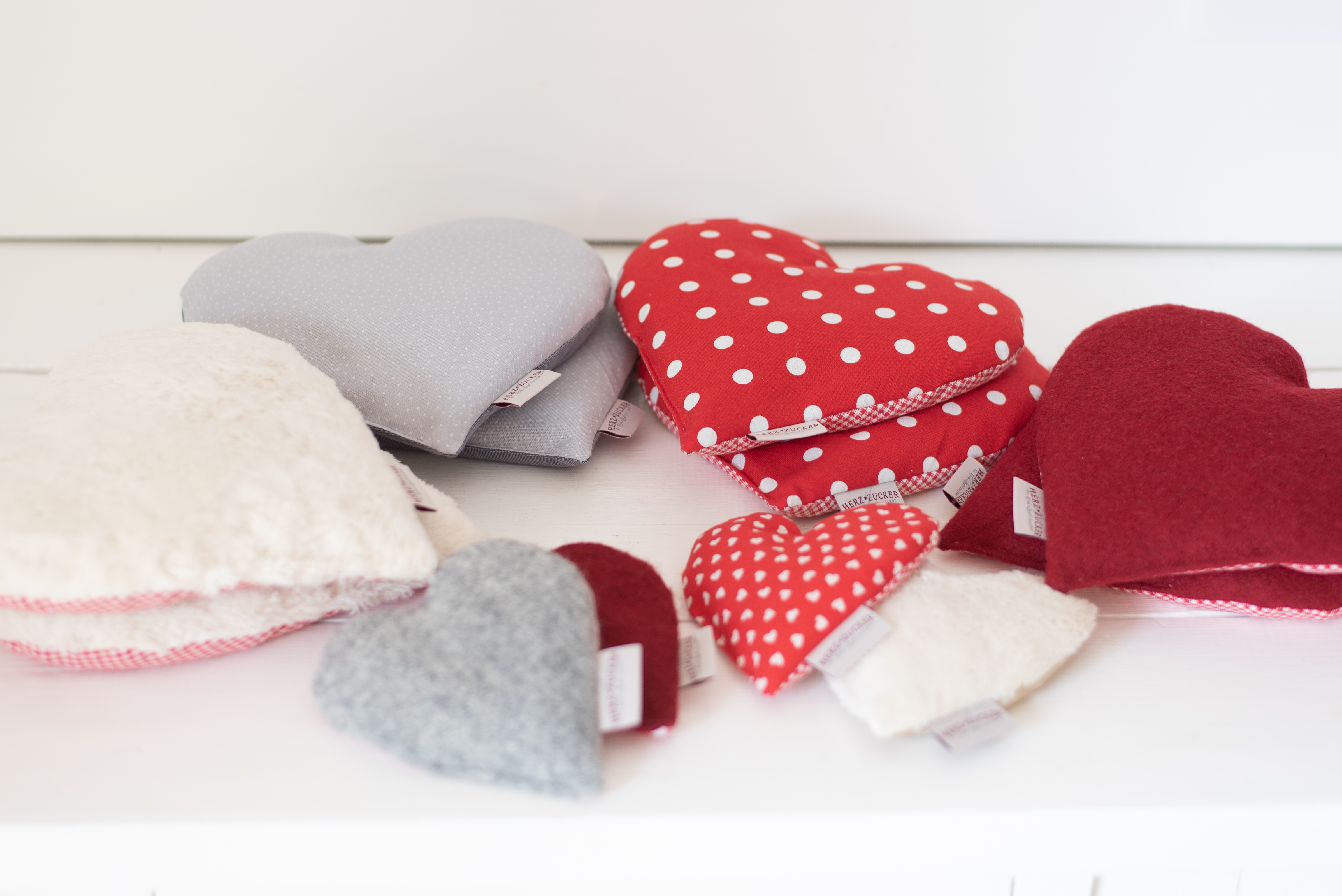 Herzzucker Herzen sind mit viel Liebe in Handarbeit genäht. Mit dieser Vielfalt aus verschiedenen Stoffen und Füllungen geht ein Herzenswunsch Ihrer Kunden in Erfüllung! Weicher Baumwollplüsch, edle Walkstoffe und 100% Baumwolle, es ist für jeden was dabei! In Rottönen, Polka dots und weißem Plüsch, wir erobern mit diesem Paket alle Herzen! Ob zum Valentinstag oder Muttertag - es gibt jeden Tag einen Grund ein Herz zu schenken ! Herzlichst, ihre Elian ♥